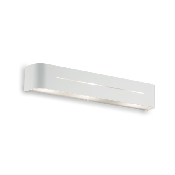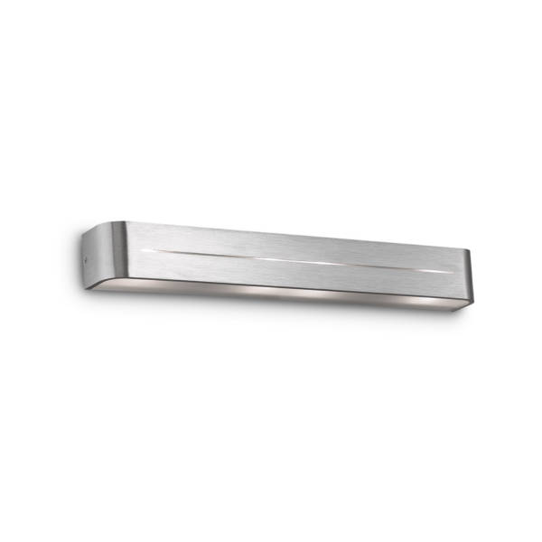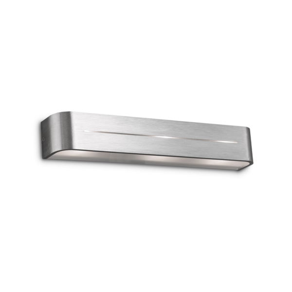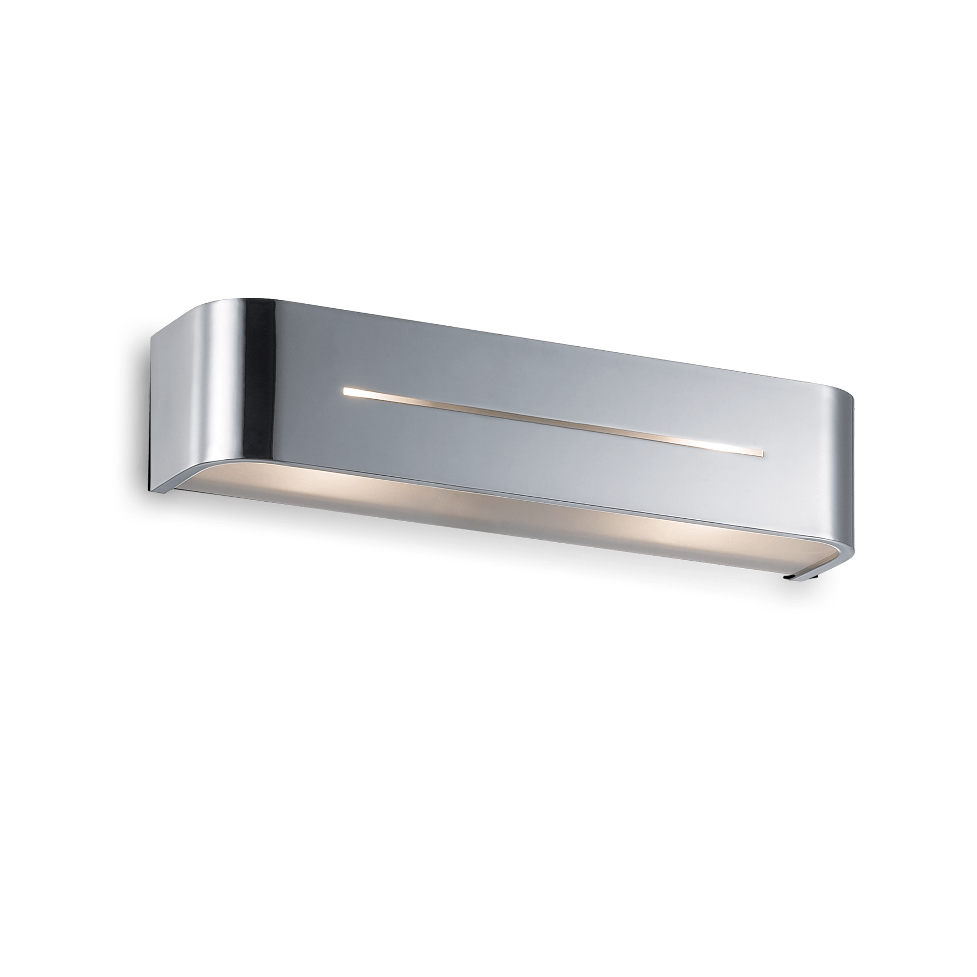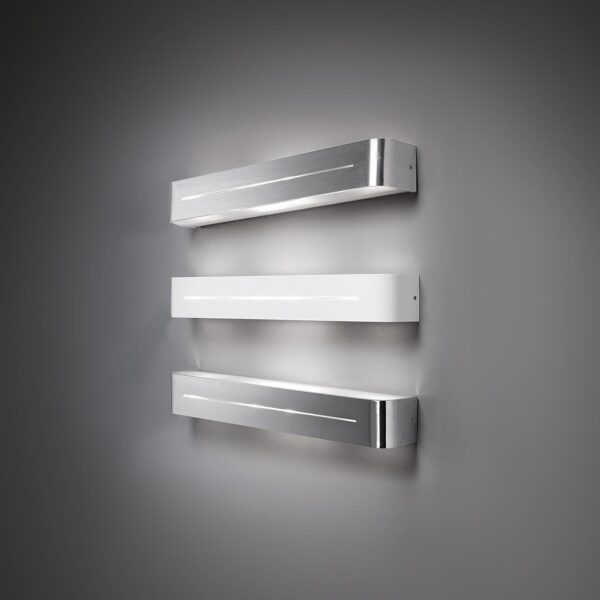 Corpo luce in metallo disponibile in alluminio spazzolato, in cromo o smaltato bianco. Diffusore composto di tre vetri trasparenti smerigliati.