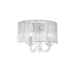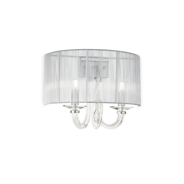 Montatura in cromo. Corpo luce in vetro soffiato e lavorato a mano. Elementi decorativi in cristallo molato. Paralume in tessuto d’organza plissettato. Copricatena in velluto.