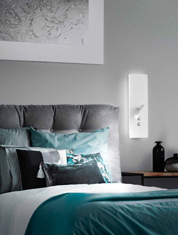 Applique in metallo verniciato a polvere colore bianco opaco con diffusore in acrilico satinato, faretto a LED orientabile e presa USB (5V – 0,6A)