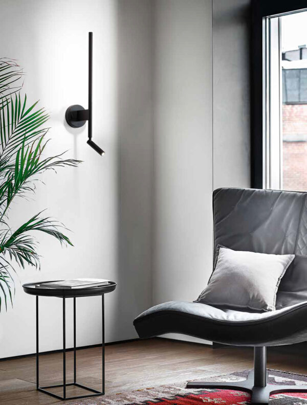 Applique in metallo verniciato a polvere colore bianco opaco, nero opaco con diffusore in acrilico satinato. Diffusore e faretto a LED orientabili a 300°