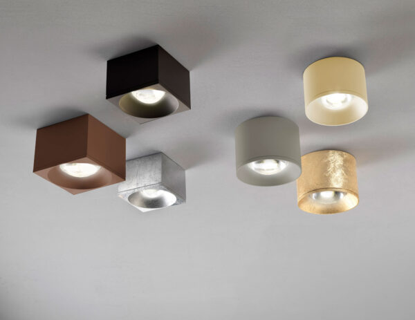 Plafoniera quadrata o rotonda, montatura in metallo verniciato. LED integrato. Diffusore a lente in vetro.