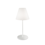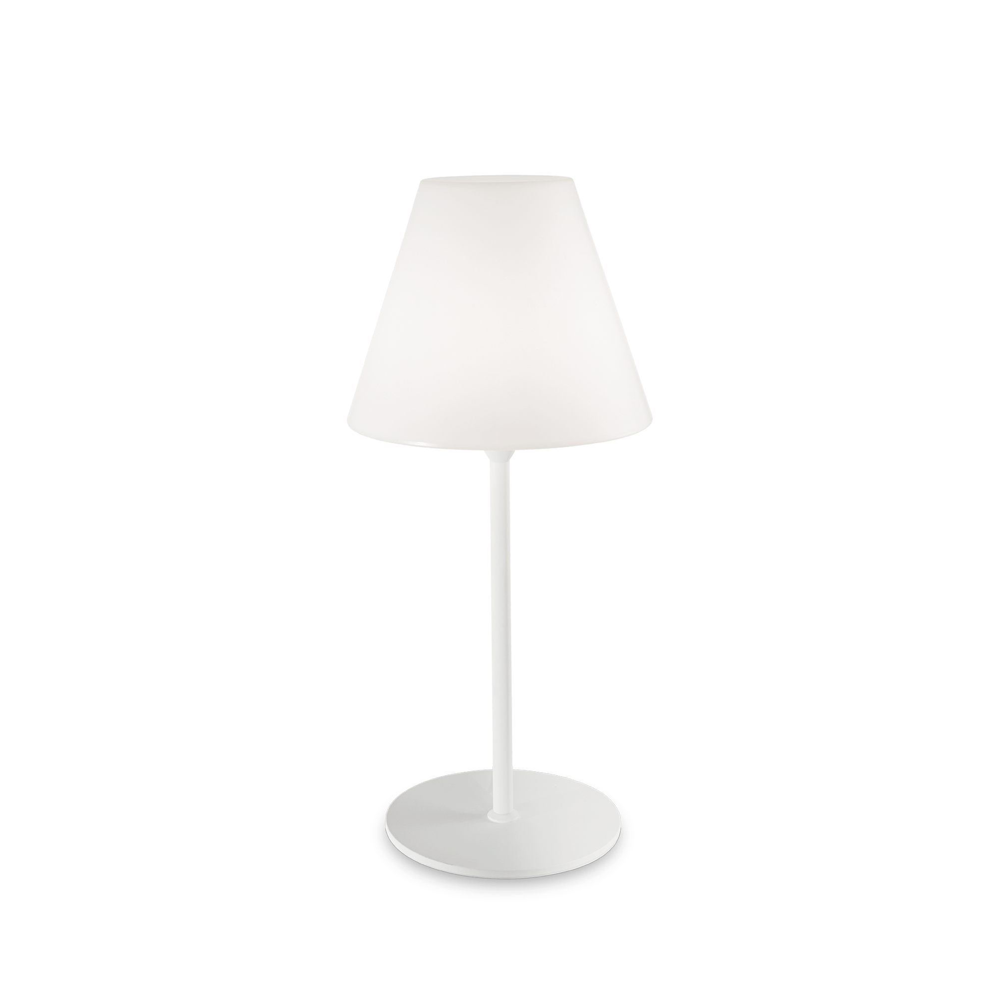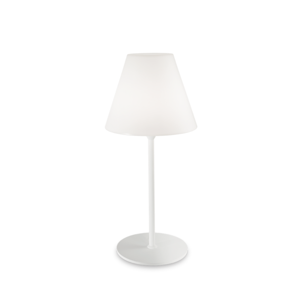 Base e stelo in metallo verniciato a polveri di colore bianco. Diffusore conico in materiale plastico color opale. Fornito con spina. IP44