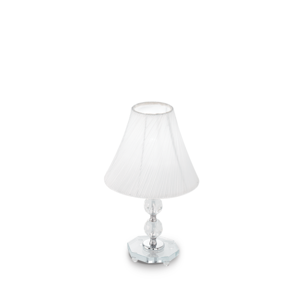 Base e corpo luce con elementi in cristallo molato e dettagli metallici con finitura in cromo. Paralume in tessuto bianco plissettato.