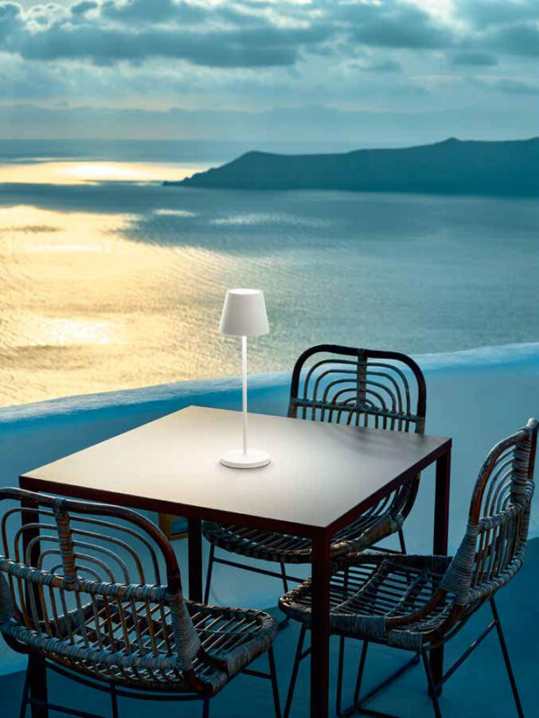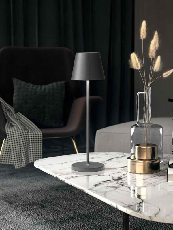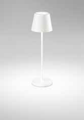 Lampada da tavolo ricaricabile a batterie in alluminio pressofuso verniciato a polvere per uso interno/esterno. Diffusore in acrilico satinato. Testina “touch” che permette l’accensione e la regolazione dell’intensità luminosa.