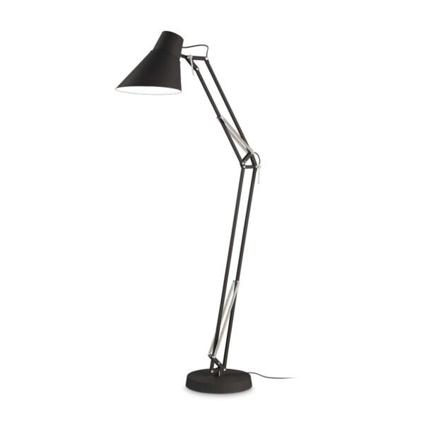 Montatura e paralume in metallo verniciato a polveri con dettagli in metallo nichelato. Struttura a braccio articolato regolabile. Interruttore incorporato sulla testa del paralume. Cavo in pvc. Colori: bianco o nero.