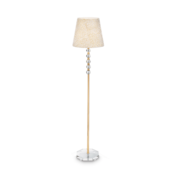 Montatura in metallo dorato con elementi decorativi e base in cristallo molato. Paralume in lamina di PVC, rivestita in tessuto con decorazione trapuntata e brillantini dorati.