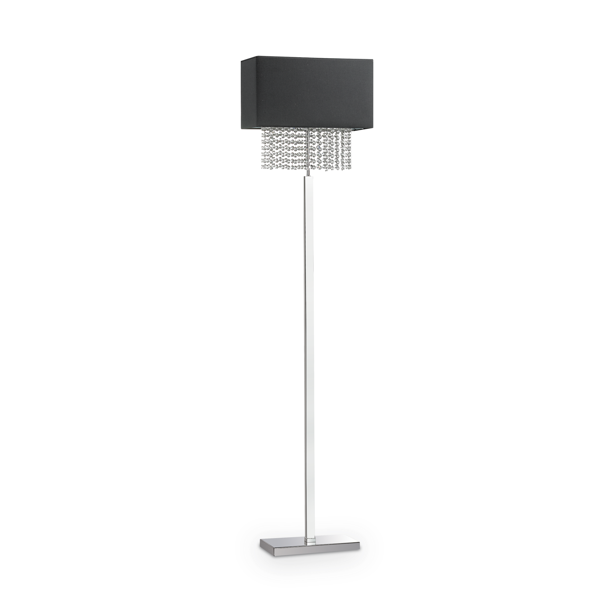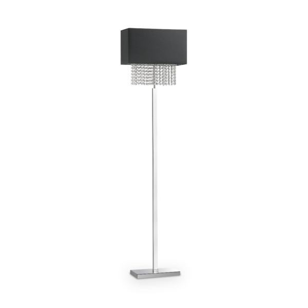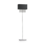 Montatura in metallo cromato. Paralume con telaio in metallo e rivestimento in tessuto.