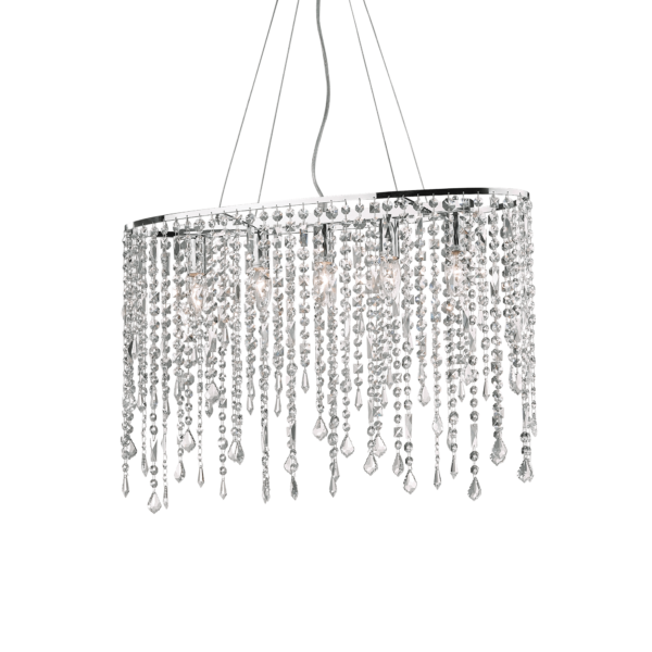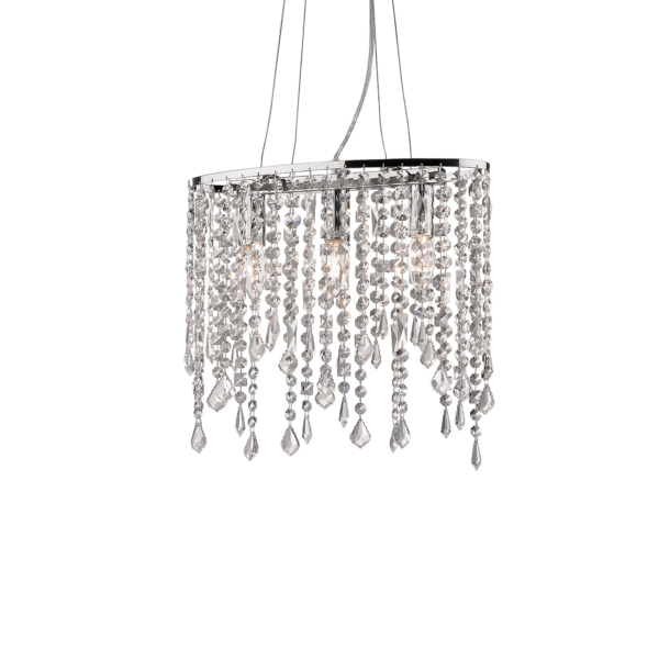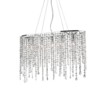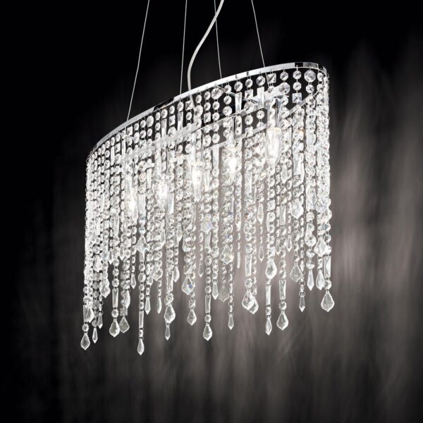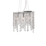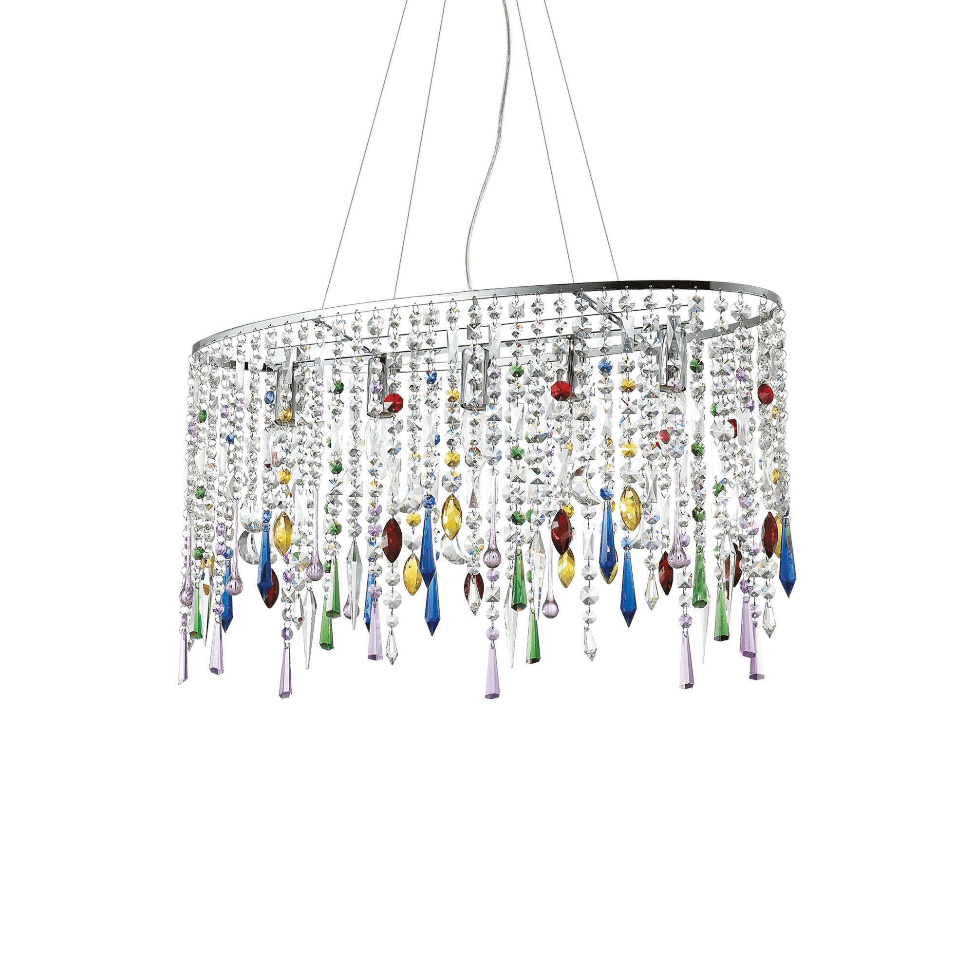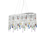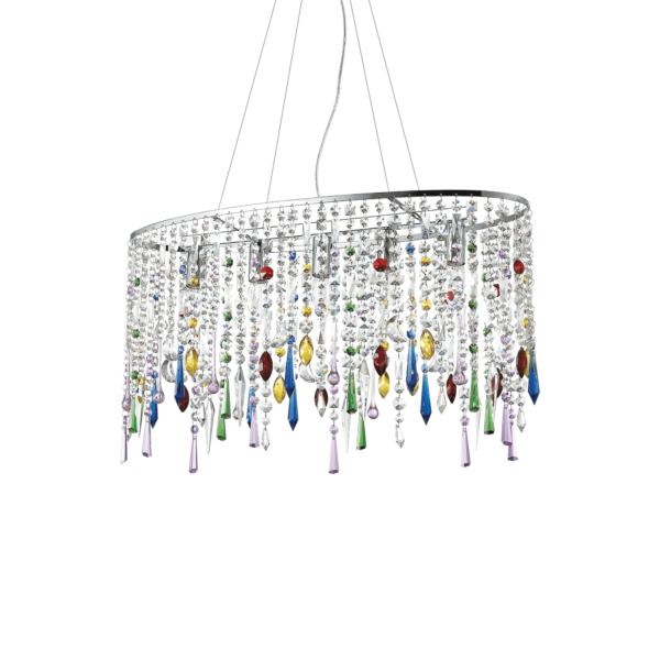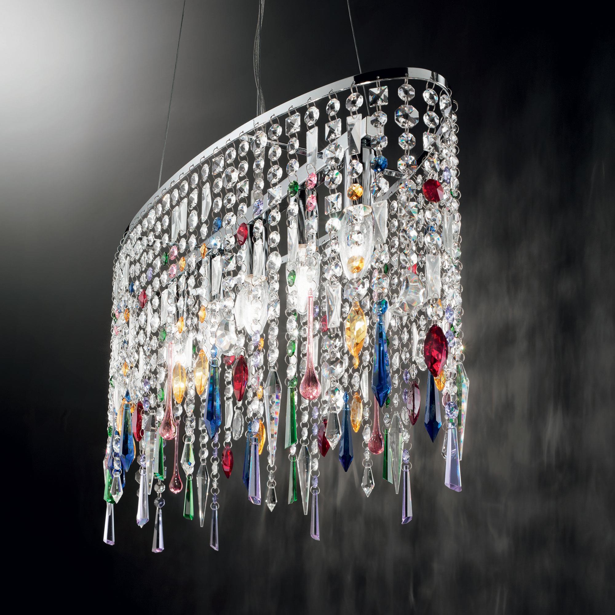 Montatura in metallo cromato. Pendagli con elementi in cristallo colorato e molato in varie forme e gocce finali. Sospensioni con cavi in acciaio a lunghezza regolabile.