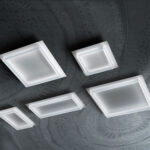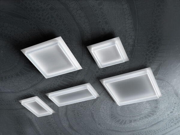 Plafoniera quadrata o rettangolare, montatura in metallo verniciato con inserti in metacrilato.