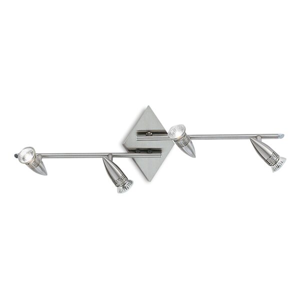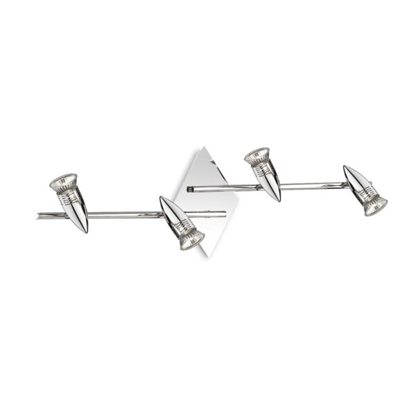 Montatura in metallo con finitura in cromo, bianco satinato, nickel satinato od ottone satinato. Corpo luce posizionabile con rotazione dello stelo e snodo per l’inclinazione.