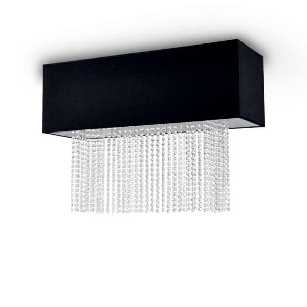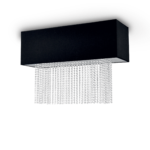 Montatura in metallo cromato. Paralume con telaio in metallo e rivestimento in tessuto. Elementi decorativi con catene di ottagoni in cristallo molato. Sospensioni con cavi in acciaio regolabili in lunghezza da dispositivi automatici.