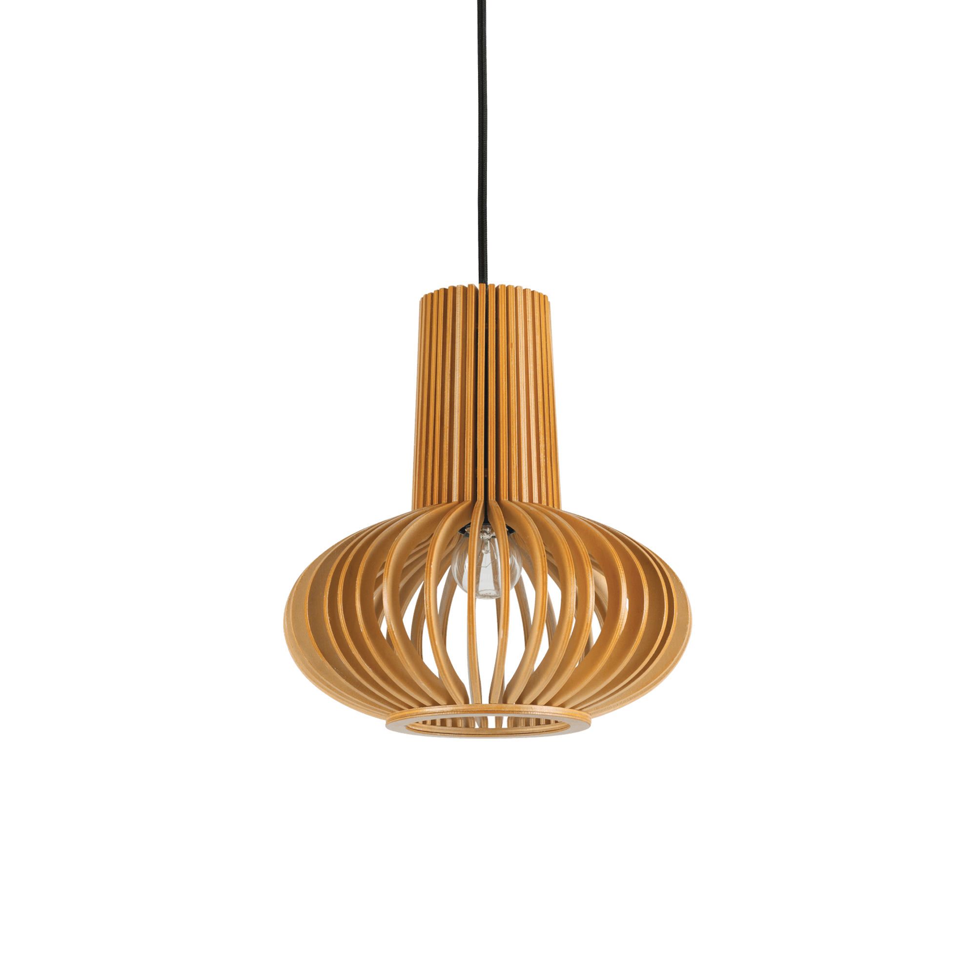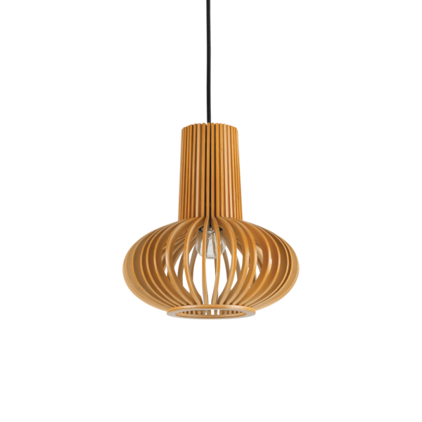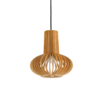 Rosone in legno naturale. Corpo luce con elementi in multistrato di legno verniciato. Cavo in tessuto nero.
