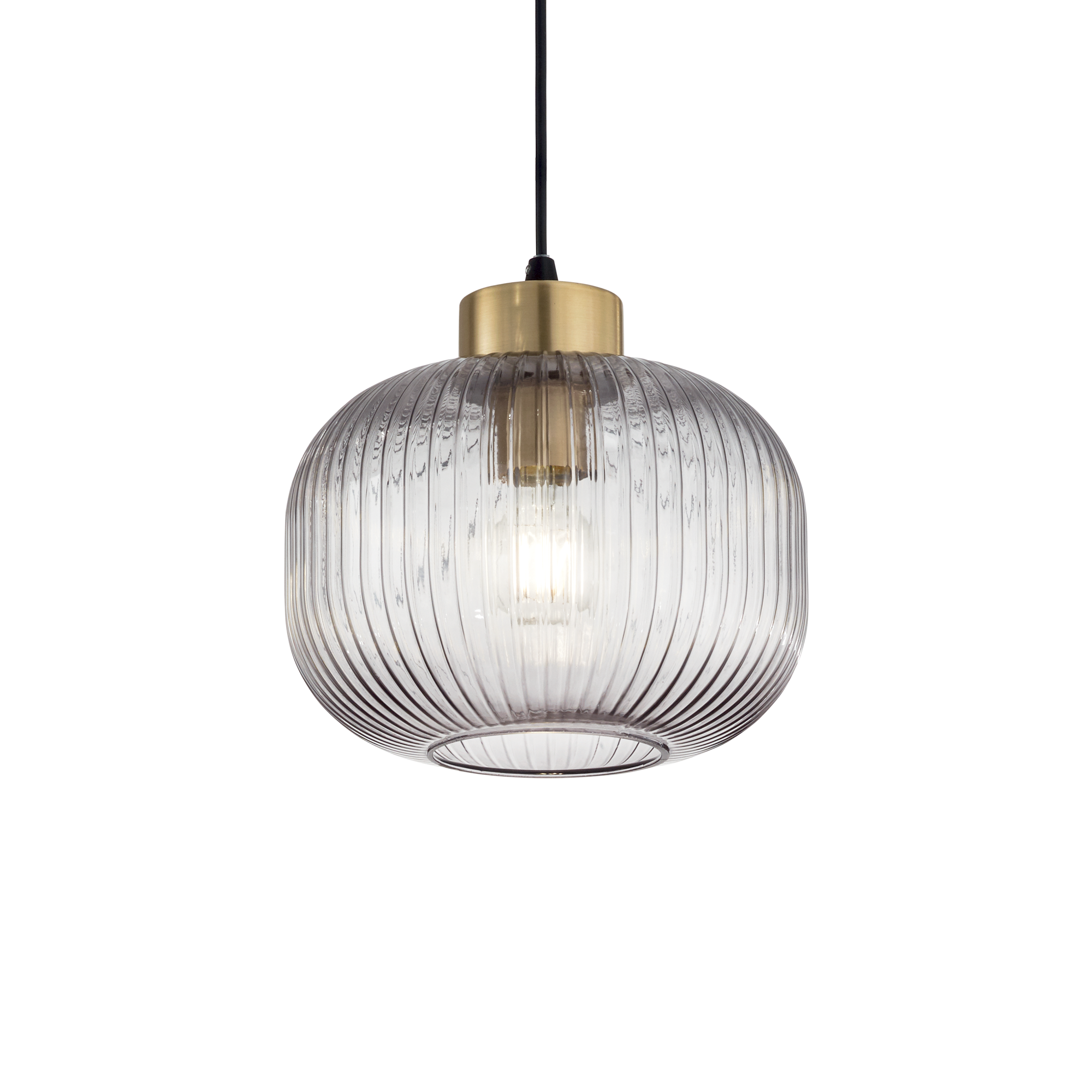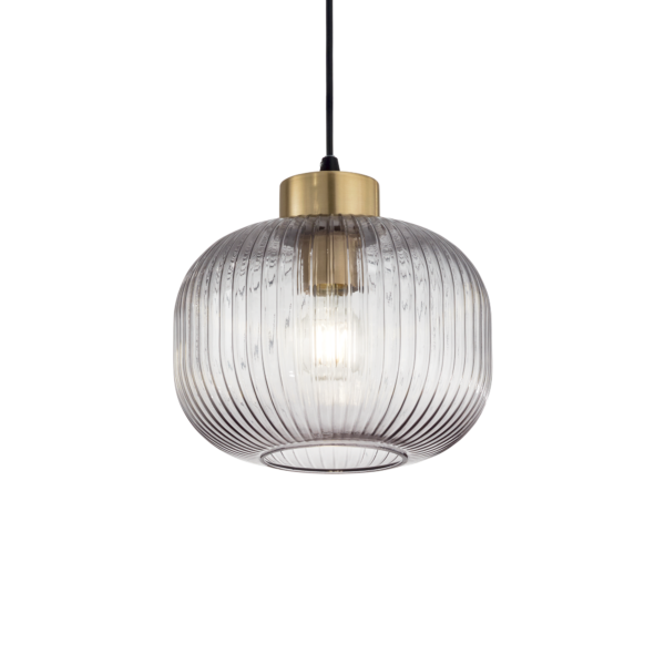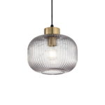 Montatura in metallo con finitura ottone satinato e rosone nero opaco. Cavo rivestito in tessuto. Diffusore in vetro soffiato con rigatura in rilievo. Disponibile nelle finiture fumÞ o verde.