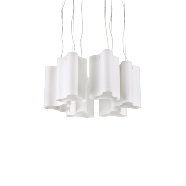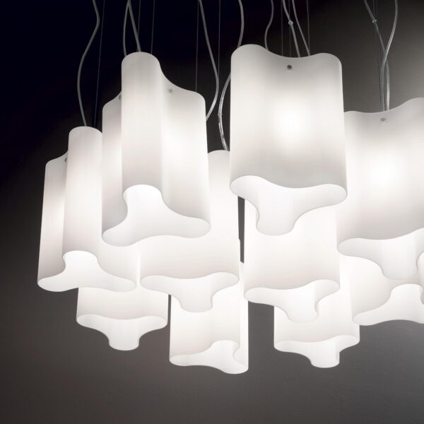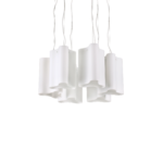 Montatura in metallo verniciato bianco opaco. Elementi diffusori in vetro soffiato bianco incamiciato e acidato.