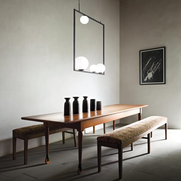 Montatura in metallo verniciato nero opaco e base con elemento in ottone satinato. Diffusori in vetro soffiato bianco, acidato. Cavo rivestito in pvc nero.