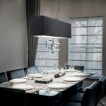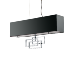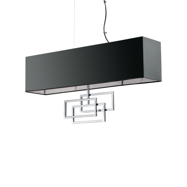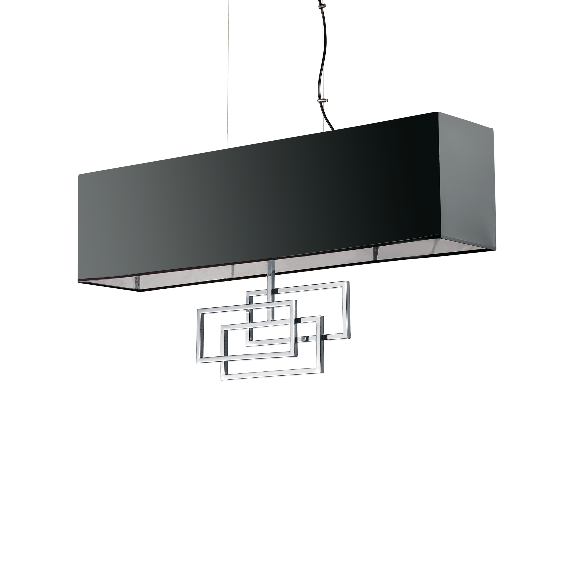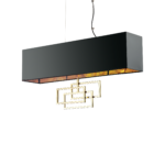 Montatura in metallo rifinita in ottone o cromo. Base nera opaca. Paralume in pvc con bordi in tessuto.