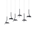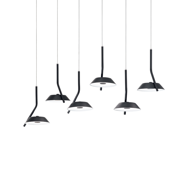 Base e montatura in metallo verniciato nero opaco. Schermo diffusore in materiale plastico opale. Led integrati.