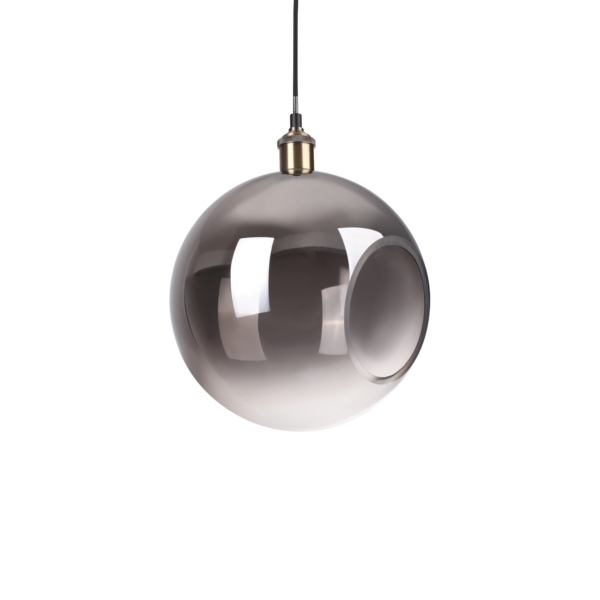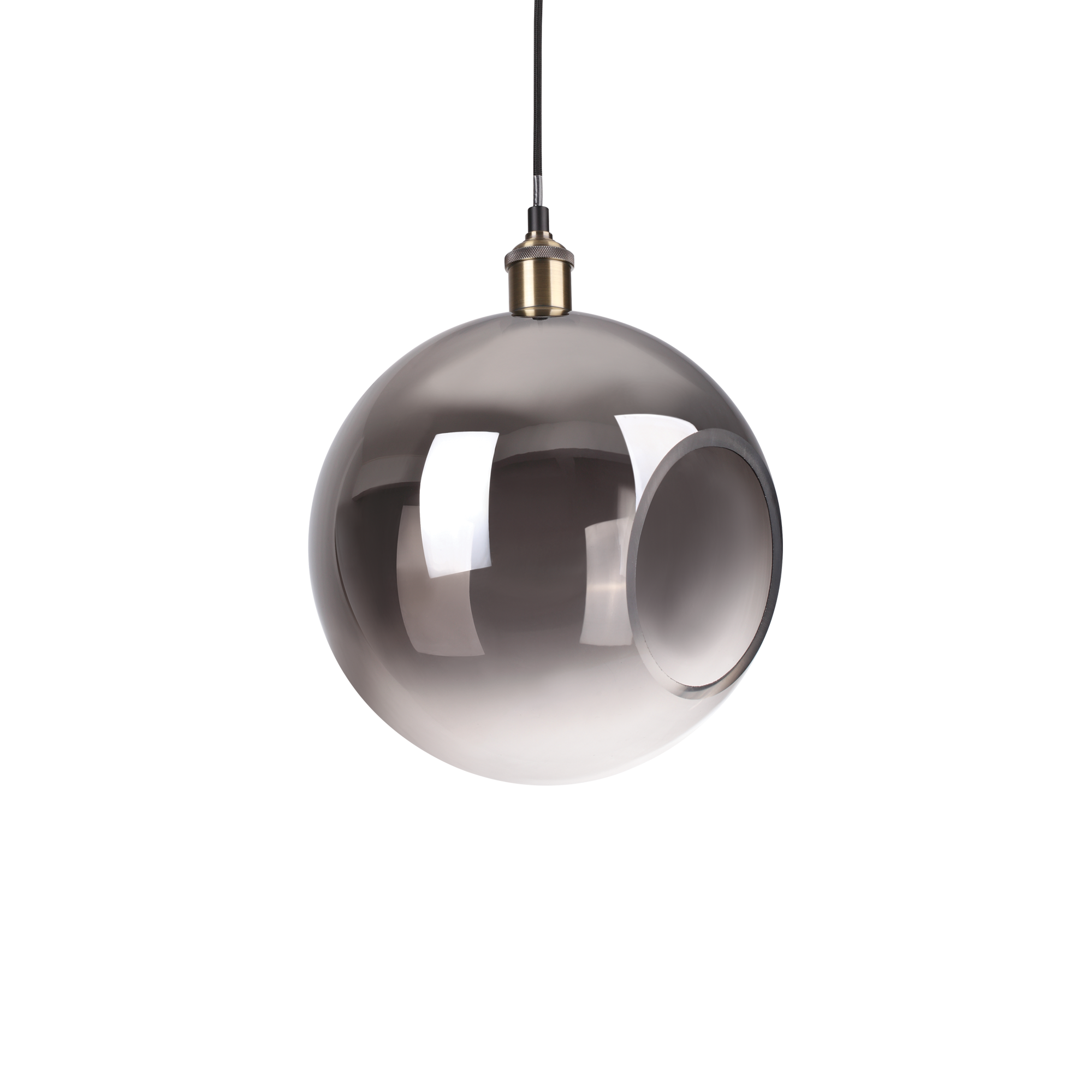 Rosone in metallo nero opaco. Cavo in tessuto. Portalampade in metallo brunito. Diffusore in vetro soffiato trasparente effetto fumÞ.