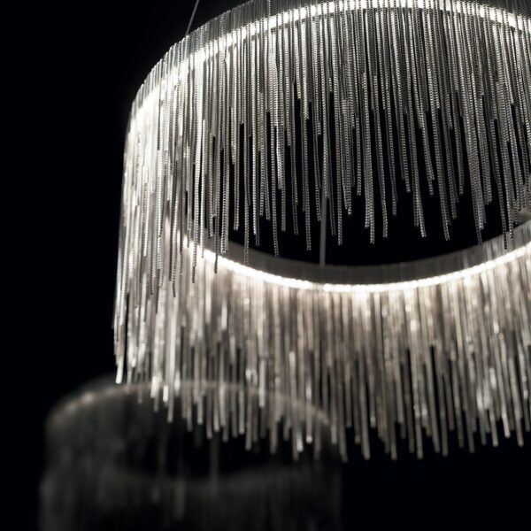 Montatura in metallo cromato. Elementi decorativi con catenine metalliche a maglia quadrata. Cavi in acciaio regolabili in altezza da dispositivi blocca cavo automatici.