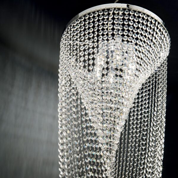 Rosone e montatura in metallo cromato. Elementi decorativi con catene di ottagoni in cristallo molato.