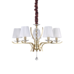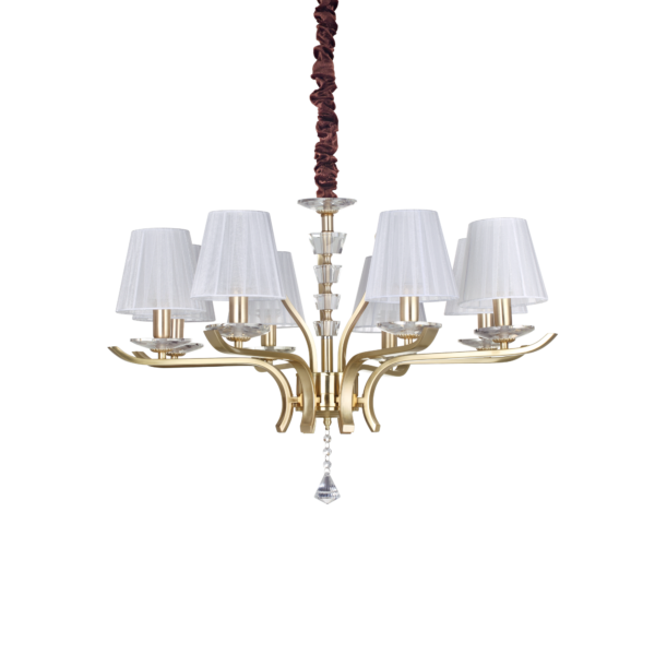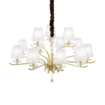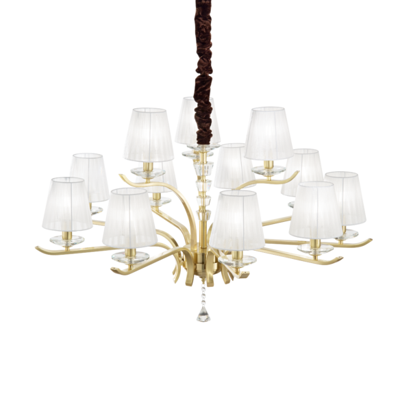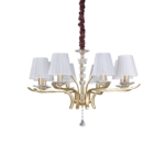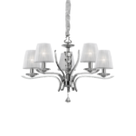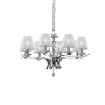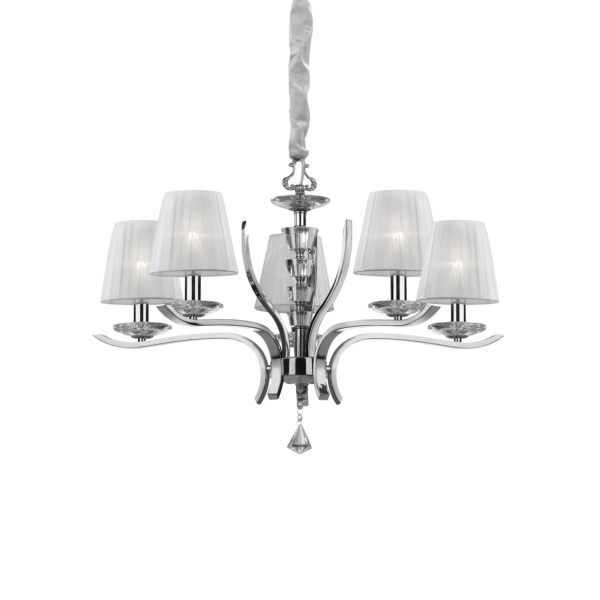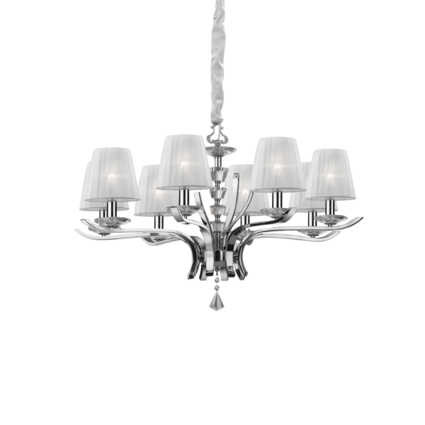 Montatura in metallo cromato oppure ottone satinato. Corpo centrale, bobeches e pendagli in cristallo molato. Paralumi in organza. Copricatena in velluto.