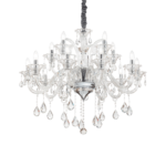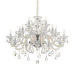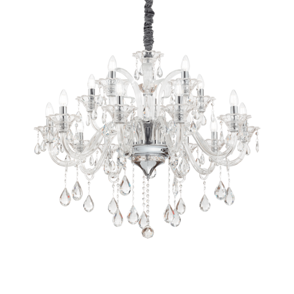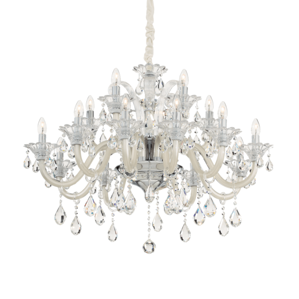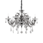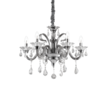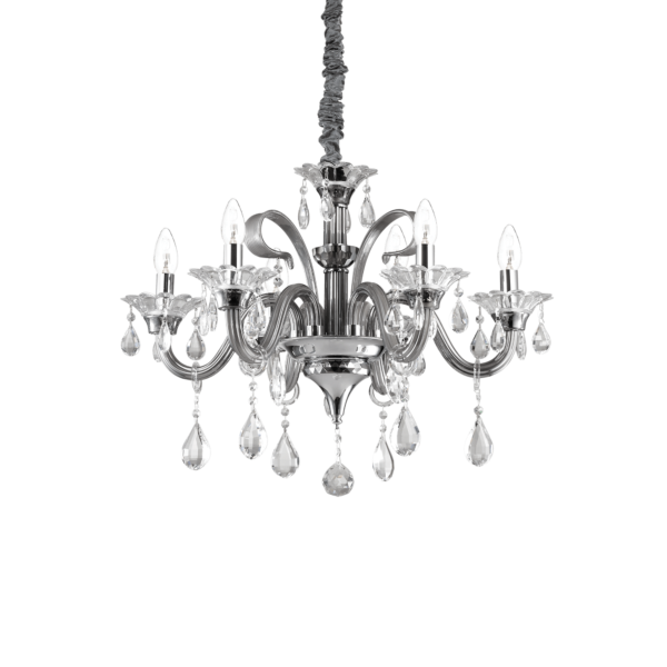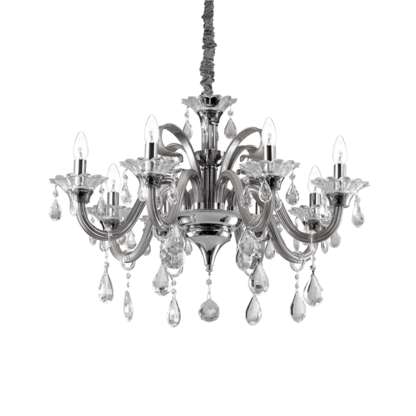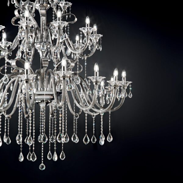 Montatura e dettagli in metallo cromato. Bracci in vetro soffiato trasparente o con interno di colore grigio o bianco avorio. Pendagli ed elementi decorativi in vetro trasparente e cristallo molato. Copricatena in velluto.