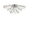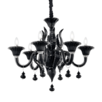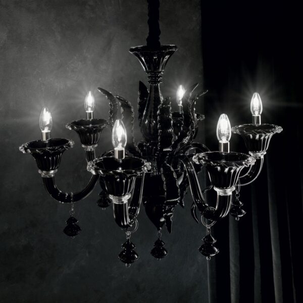 Lampadario in vetro soffiato e lavorato a mano. Dettagli in metallo cromato.