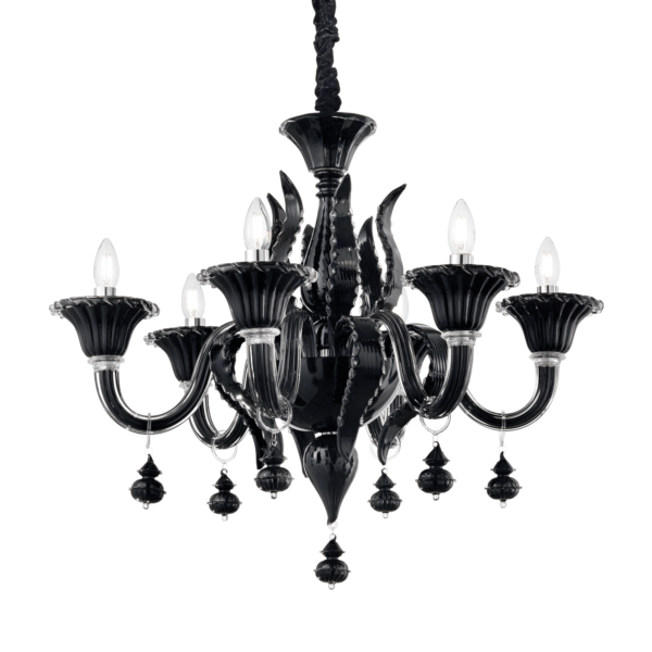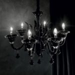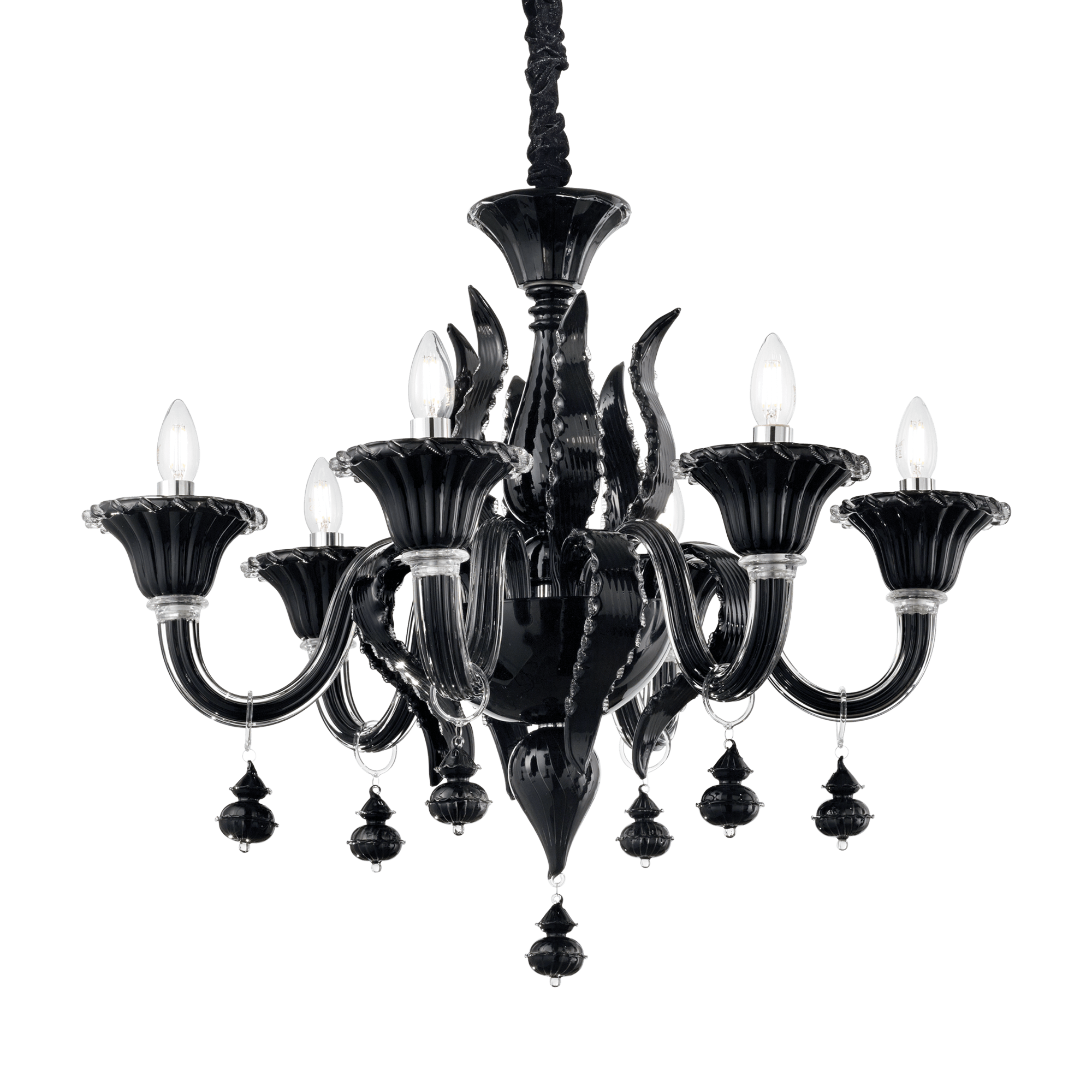 Lampadario in vetro soffiato e lavorato a mano. Dettagli in metallo cromato. Copricatena in velluto.